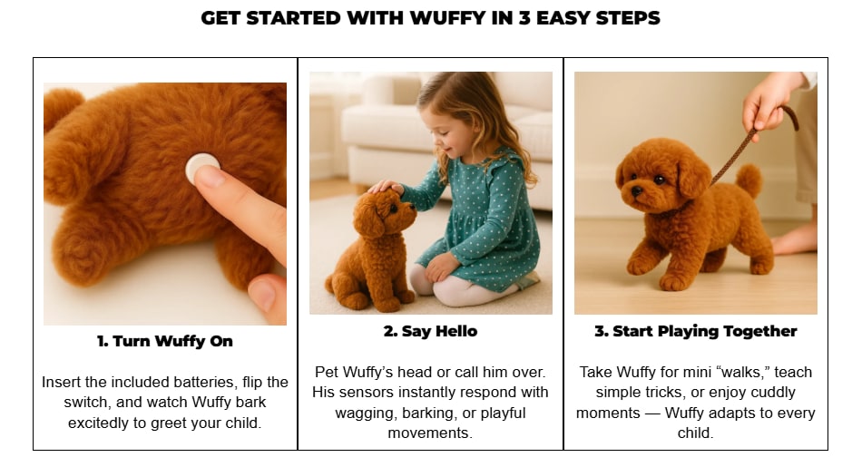There is no mess, no fur, no food, and no daily maintenance. This makes Wuffy Dog especially appealing to busy parents and grandparents who want a safe and simple companion toy for children.